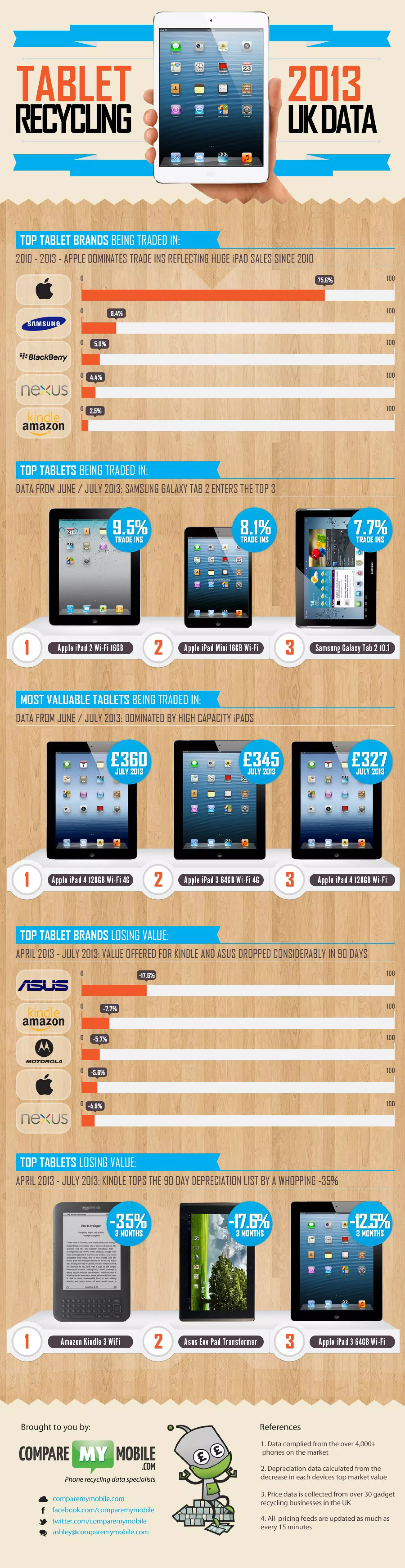 Tablet computers are becoming increasingly popular in the technology world, especially with recent releases such as Apple's iPad Air, Samsung's Galaxy Note Range and Google's Nexus devices. With the development of tablets comes the development of tablet trade-ins/recycling - and this is what this infographic hopes to spread awareness of. The infographic was put together by leading gadget recycling comparison engine CompareMyMobile.com - who compare over 40 UK recycling companies on price and consumer reviews. They say that tablet trade-ins are increasingly popular, especially certain brands. Data on the graphic shows top tablet brands and models being traded-in as well as the the most valuable models and those losing value most quickly.