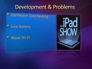This document discusses the innovation and adoption of the iPad by Apple. It provides background on Steve Jobs' announcement of the iPad in 2010. By the end of 2010, Apple had sold 15 million iPads, growing to 58.31 million iPads sold in 2012. The document also outlines Apple's distribution strategy through retail stores and online channels. It describes the innovation adoption process and how different groups served as innovators, early adopters, early majority and late majority for the iPad technology.