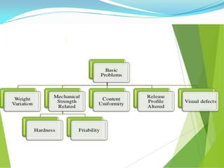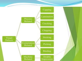 The document discusses various defects observed during the manufacturing of tablets, particularly focusing on capping, lamination, chipping, cracking, sticking, binding, and mottling. It provides corrective measures related to formulation and equipment adjustments to remedy these defects, such as optimizing moisture content, adjusting binder levels, and ensuring proper lubrication. The summary also highlights the importance of machine settings and granule characteristics in maintaining tablet quality.
