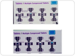The document provides an overview of tablets, including their definition, ideal characteristics, classification, advantages, and disadvantages. Tablets are defined as compressed pharmaceutical solids and are the most common oral dosage form due to ease of administration. They are classified based on release mechanism (immediate vs sustained), administration route (oral, sublingual, etc.), and manufacturing method (compressed, molded, etc.). Compressed tablets have the highest production efficiency and lowest cost but may have bioavailability issues for some drugs. Other tablet types include effervescent, chewable, film coated, and controlled release tablets.