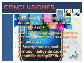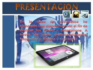 A smartphone is a mobile phone that performs many of the functions of a computer. It typically has a touchscreen interface, internet access, and an operating system capable of running downloaded applications. Smartphones can access the internet, have apps for various functions, and some can connect to mobile networks like 3G and Wi-Fi. They come in screen sizes ranging from 7 to 10 inches and popular examples include the iPhone and Android devices. Tablets are similar but have larger screens, typically ranging from 7 to 10 inches.