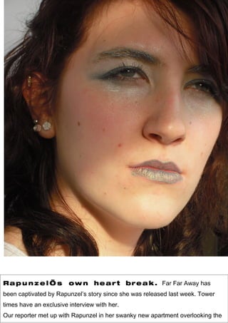 Rapunzel speaks publicly for the first time about her experiences in the tower, including the heartbreak caused by her long hair. A publication secured an exclusive interview with Rapunzel to discuss her story directly after being released from the tower last week. The article promises exclusive pictures and details of Rapunzel's own heartbreak from her tower times.