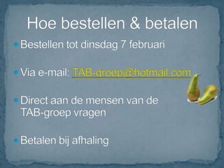 Penningmeester & verantwoordelijke TAB-groep Katja: PR verantwoordelijke Alexandra: Administratief manager Ivo: Commercieel manager Jorne: Commercieel assistent Joost: Logistiek & transport manager