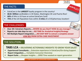 This document discusses loyalty card analytics solutions from TABS LCATM. It highlights that ExtraCare is the largest loyalty program in the US with over 68 million cardholders. TABS LCATM offers an integrated reporting suite that analyzes over 20 ExtraCare reports to provide complete shopper insights. Their solution delivers actionable insights through experienced consultants and pre-built Excel dashboards to help grow sales. TABS LCATM provides various report suite and custom analytic options for clients.