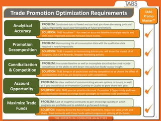 The document discusses TABS PromoMaster, a trade promotion optimization solution. It addresses problems with inaccurate baselines from syndicated data and incomplete data. TABS PromoMaster provides improved methodology, an intuitive software solution, and robust data harmonization. This includes an accurate baseline called TABS AccuBase, actionable ROI metrics, and harmonization of all relevant promotion data. The solution delivers customizable dashboards, maintains the database, and builds client capabilities. Case studies demonstrate how TABS PromoMaster helps clients maximize trade funds, revise promotion strategies, and reduce spending while maintaining sales.