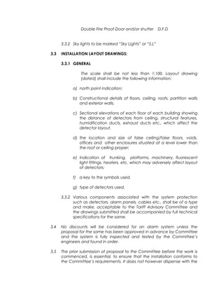 The document outlines rules for fire alarm systems, including general requirements for submission plans. Plans must be clear, labeled, and to scale. They must show all buildings, openings, and boundaries. Installation layout drawings must be to a scale of at least 1:100 and include north point, construction details, elevations, false ceilings/floors, and equipment locations. Various system components must be approved. Inspections are required and discounts provided once systems are found in working order. Detector types - heat, smoke, and flame - are described along with their appropriate uses.