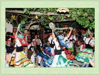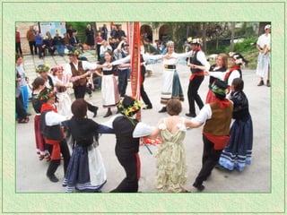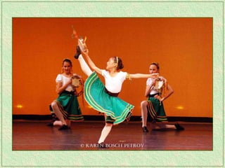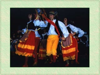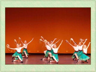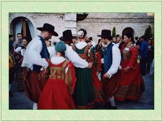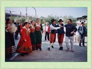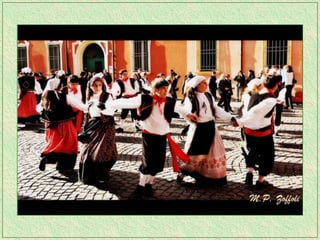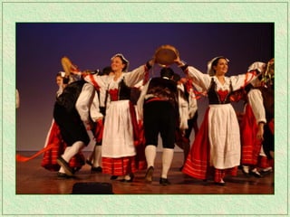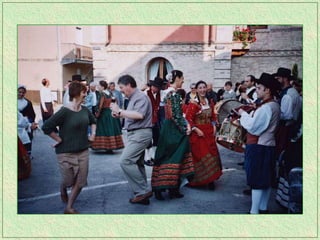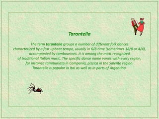 The tarantella is a fast-paced folk dance from Italy typically in 6/8 time, characterized by tambourines and varying names across regions. It remains one of the most recognized forms of traditional Italian music and has spread to parts of Argentina as well. The dance originated in Campania and the Salento region of Italy.