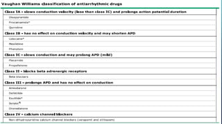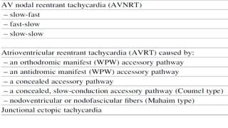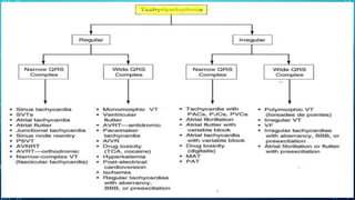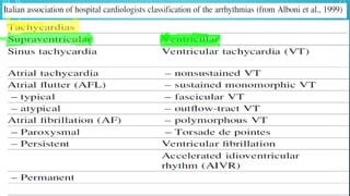 This document provides an overview of tachyarrhythmias, including their causes, clinical manifestations, and treatment approaches. It discusses various types of arrhythmias such as sinus tachycardia, atrial fibrillation, atrial flutter, premature ventricular contractions, ventricular tachycardia, and ventricular fibrillation. For each type, it outlines the etiology, characteristics, management strategies including medication and procedures. The document is an educational guide for healthcare providers on understanding and managing different cardiac arrhythmias.