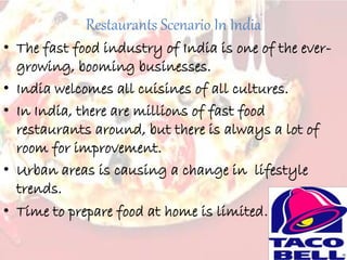 The fast food industry in India is experiencing significant growth, particularly with international chains like Taco Bell, which specializes in Mexican cuisine such as tacos and burritos. Taco Bell, founded in 1962 and a subsidiary of Yum! Brands, targets urban areas with a diverse menu that includes a 50% vegetarian selection tailored for Indian consumers. It faces competition from other restaurants while capitalizing on trends towards quick service and hygienic food options.