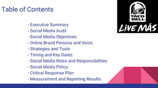 Taco Bell's social media strategy for 2017 focuses on increasing website traffic, growing their social media following, and boosting engagement. Their primary social networks are Twitter, Instagram, and Snapchat. The objectives are to increase brand identity, posts, and followers by 5% in two months. Strategies include paid, owned, and earned posts using hashtags, contests, and filters. Key dates are holidays and Taco Tuesdays. Roles include the CEO, social media manager, and social & digital experience manager. Metrics include follower counts, weekly activity, and engagement rates.