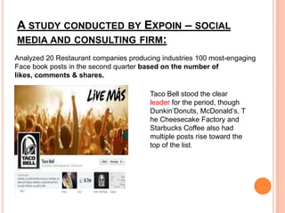 1) Taco Bell had the most engaging Facebook posts in the second quarter based on metrics like likes, comments, and shares. They focused on visual posts that connected with their target audience in a unique way.