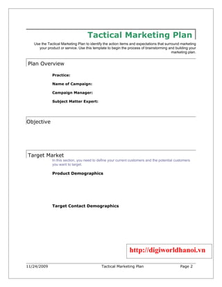 This document is a template for a tactical marketing plan that identifies action items and expectations for marketing a product or service. It includes sections for the plan overview, objective, target market, message summary, call to action, process, opportunity qualification, project plan, metrics, and approval. The target market section defines current and potential customers. The call to action provides desired outcomes and offers. The process lists development, prospecting, and follow-up. The project plan outlines necessary resources and budget. Metrics and expectations are also identified.