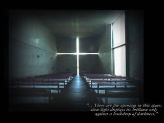 Tadao Ando is a Japanese architect known for his minimalist concrete designs that emphasize empty space and simplicity. Ando was strongly influenced by Japanese culture and religion in his emphasis on nothingness and haiku-like designs. He is a self-taught architect who believes architecture can reform society by changing how people live and the identity of places. Ando creates spaces that respond to human spirituality through the juxtaposition of solid concrete walls and natural light.