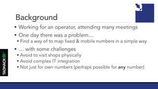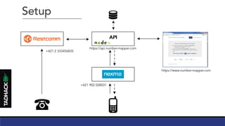 This service maps a fixed number to a mobile number purely based on calling line identification. It is based on a self-developed API, Nexmo for handling SMS, and Restcomm for handling fixed line calls and their authentication logic.