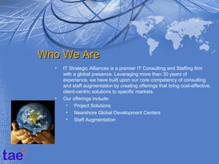 IT Strategic Alliances is an IT consulting and staffing firm with global presence and over 30 years of experience. They offer specialized services tailored to clients' unique needs and goals. Their strategy is to provide tailored solutions through full project teams, responsibility for deliverables, or complete accountability. They have capabilities in areas like ERP implementation, testing, legacy systems, BI, and application maintenance through locations in North America and Europe. Partnering with them can help reduce costs, control spending, and increase shareholder value through proven methodologies and risk mitigation.