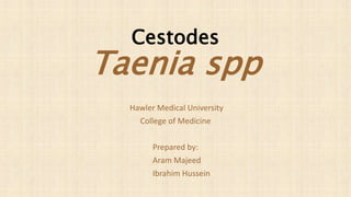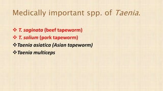 This document summarizes key information about Taenia species, including T. saginata, T. solium, T. asiatica, and T. multiceps. It describes the medically important species, diseases they cause, hosts, morphology, life cycles, transmission, diagnosis and treatment. T. saginata and T. solium cause taeniasis in humans. T. solium can also cause cysticercosis, which can lead to seizures. T. saginata uses cattle as an intermediate host while T. solium uses pigs. Diagnosis involves examining stool for eggs or proglottids. Cysticercosis is diagnosed via imaging, biopsy or serology. Treatment