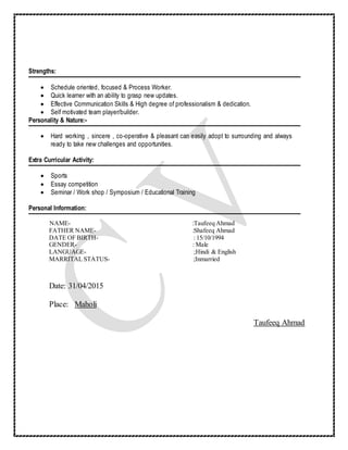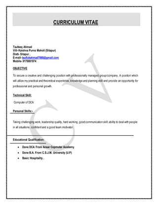 Taufeeq Ahmad is seeking a challenging position that utilizes his practical experience, knowledge, and planning skills. He has a DCA from Ansar Computer Academy and a B.A. from C.S.J.M. University. His strengths include being schedule-oriented, a quick learner, having strong communication and professionalism skills, and being self-motivated and able to work as part of a team. He enjoys sports, essay competitions, and participating in seminars.