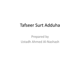 This document provides a summary and analysis of Surah Adduha. It begins by summarizing the context and reasons for revelation, noting that the surah was revealed to reassure the Prophet during an illness when critics claimed his Lord had abandoned him. It then analyzes each verse, noting how they reference the Prophet's early life experiences as an orphan and how Allah guided and provided for him. The document concludes by emphasizing the overarching message to proclaim Allah's favors and bounties, and to be kind to orphans and the poor as the Prophet once was in those situations.