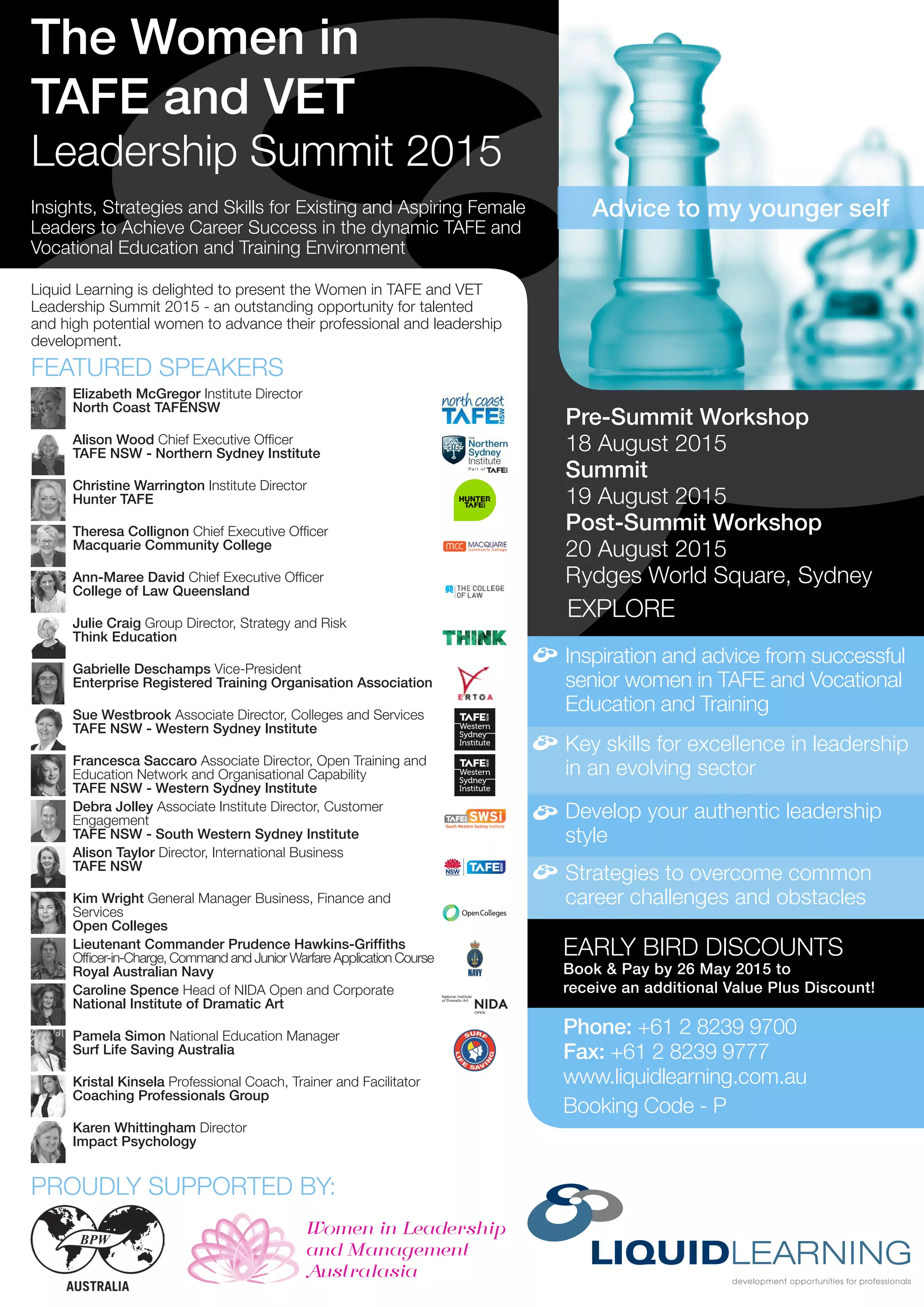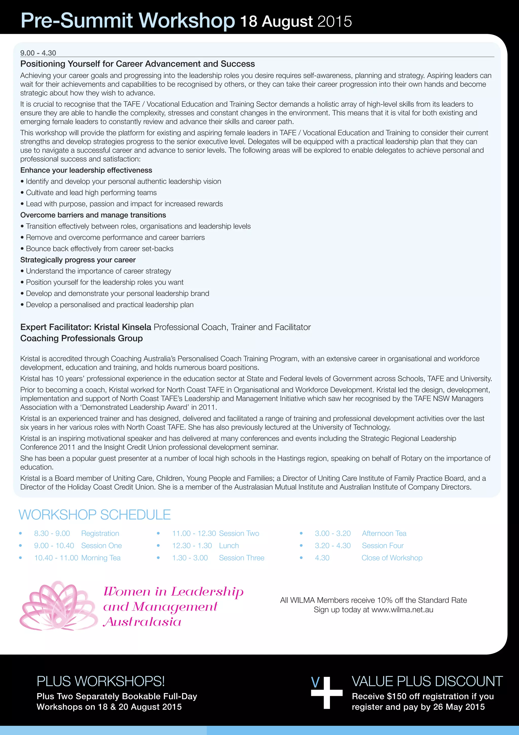 The document summarizes an event for women leaders in TAFE and vocational education. It includes a pre-summit workshop on August 18th, the main summit on August 19th, and a post-summit workshop on August 20th, all taking place in Sydney. The summit and workshops aim to provide insights, strategies and skills for existing and aspiring female leaders to achieve career success in the vocational education sector. It features case studies and panels from senior women leaders in the field who will share advice and lessons learned. Topics include developing an authentic leadership style, overcoming barriers, and maximizing career opportunities.