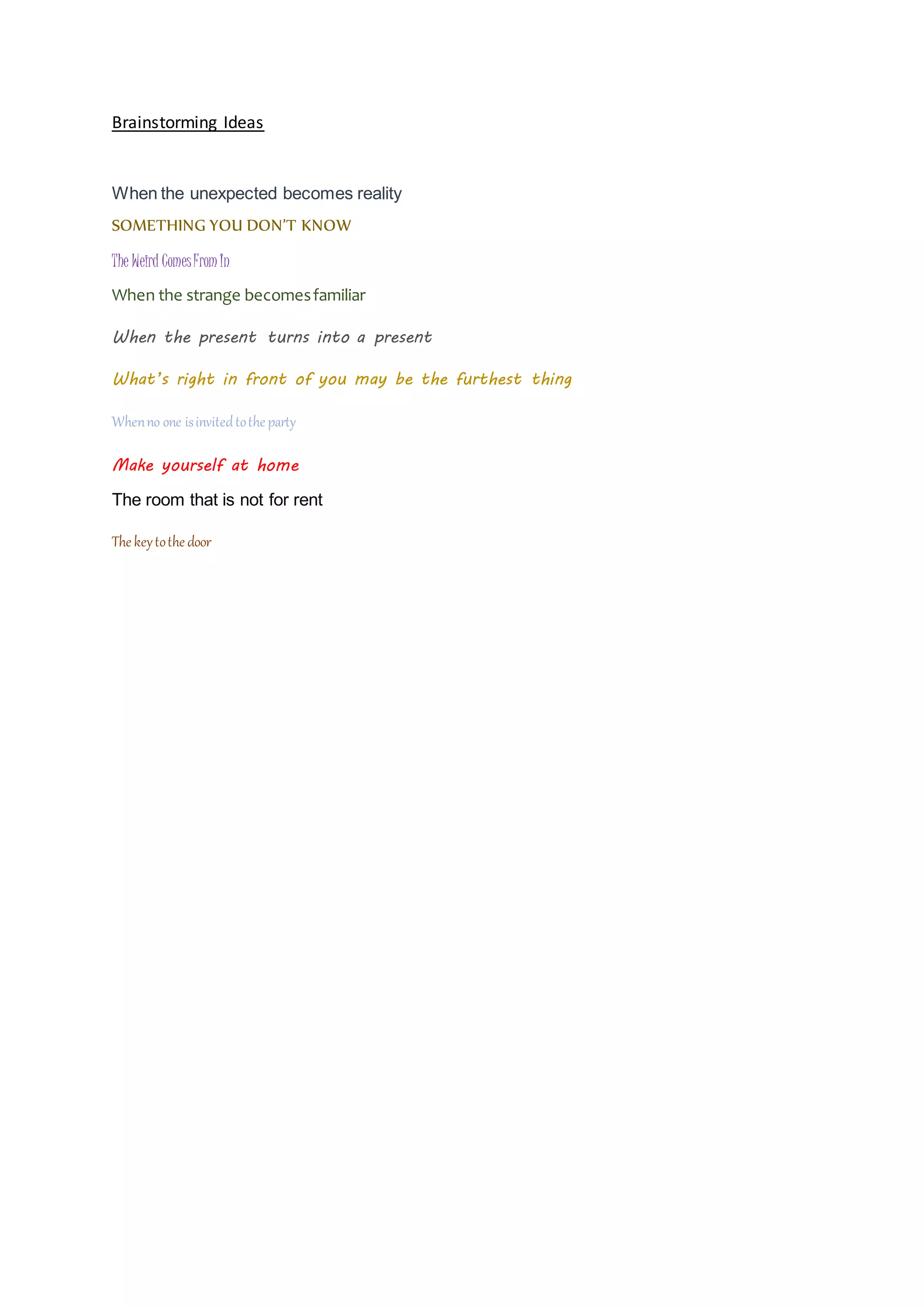 This document provides cryptic and abstract phrases that could spark ideas for brainstorming such as "When the unexpected becomes reality", "The Weird Comes From In", and "When no one is invited to the party". The phrases seem to encourage unconventional thinking by suggesting that things are not always as they seem on the surface.