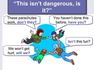 This document discusses the use of negative yes/no questions and tag questions in English. It provides examples of how to form negative yes/no questions and tag questions, and how intonation differs depending on whether the speaker expects agreement or wants to confirm information. It also gives guidelines for answering negative yes/no questions and tag questions, and provides exercises for students to practice forming dialogues using these question types.