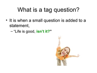 Tag questions are short questions added to statements to encourage conversation. They are used in informal situations but not in formal writing. Tag questions keep conversations going by giving the other person a chance to respond. To form a tag question, the statement's verb is changed from positive to negative or vice versa. If there is no auxiliary verb, "do" or "does" is used instead. Properly formed tag questions have a statement followed by a short question tag.