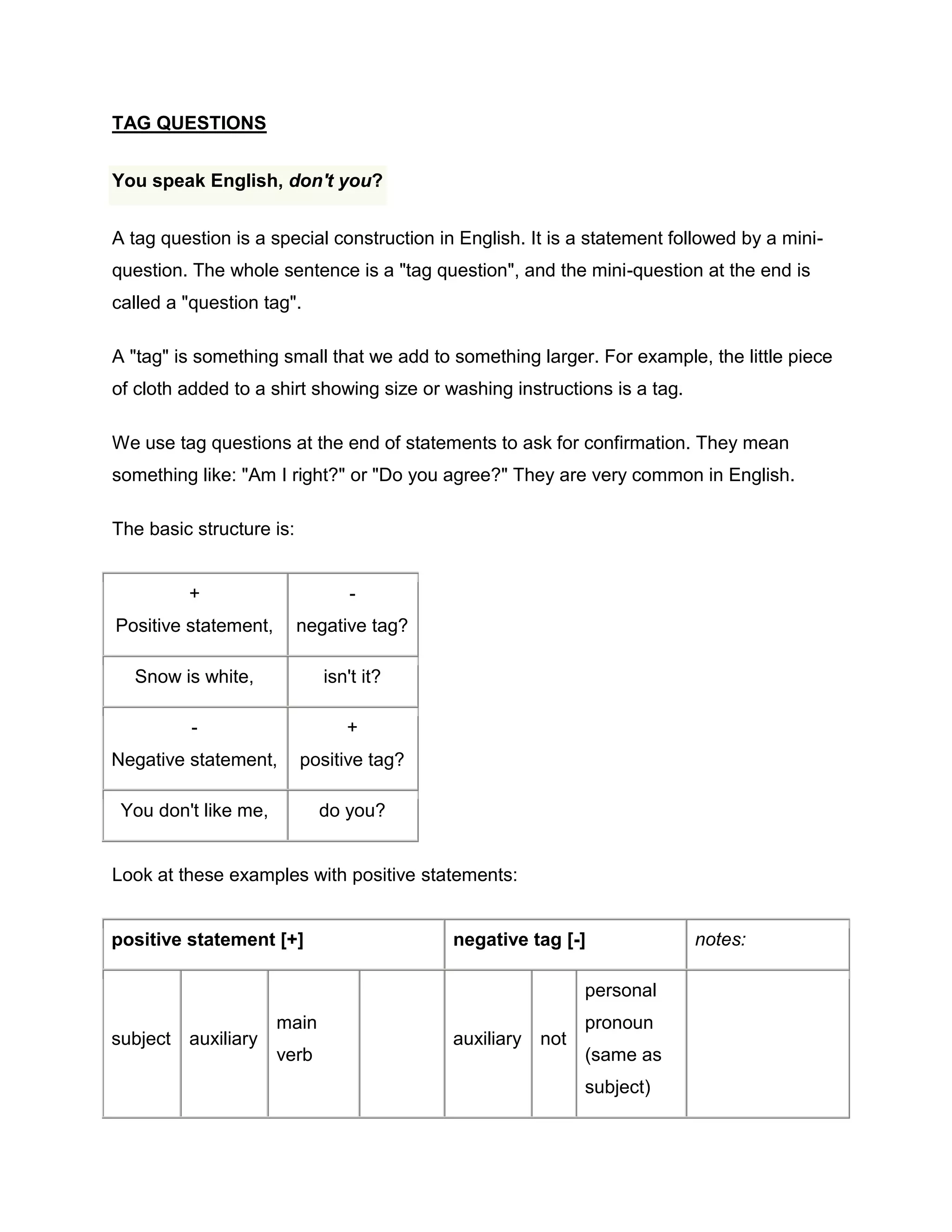 Tag questions are statements followed by a short question at the end to request confirmation or agreement. They follow the structure of a positive statement with a negative tag or vice versa. The intonation and meaning can change depending on whether it is a real question or a statement. Answers to tag questions should reflect the true facts rather than simply agreeing with the question. Question tags are also sometimes used with imperatives for invitations or orders.