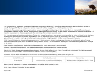 The document provides an overview of strategies for achieving a healthy financial life, including budgeting, investing, retirement savings, and financing a home. It discusses developing a budget and paying down high-interest debt. It also covers topics like buying vs renting a home, creating an investment portfolio based on goals and risk tolerance, saving for retirement through vehicles like 401ks and IRAs, and tips for young investors like starting to save early.