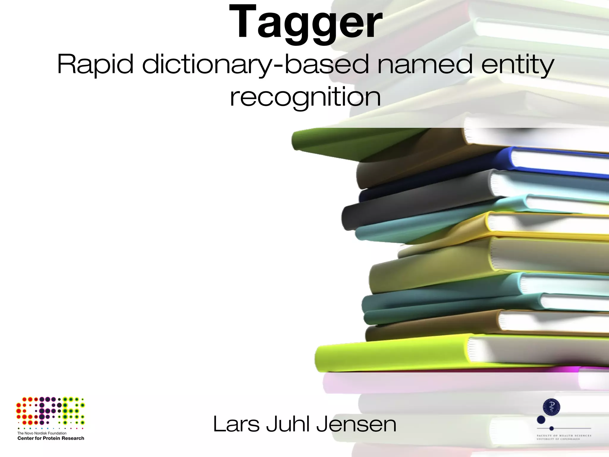 Tagger is a named entity recognition tool that can process over 1000 abstracts per second using a dictionary-based approach. It achieves 70-80% recall and 80-90% precision using comprehensive dictionaries, expansion rules, and a curated blacklist to identify entity types like genes, proteins, chemicals, and diseases. The tool has a C++ engine, is inherently thread-safe, and includes interactive annotation, Python wrappers, and a REST API.