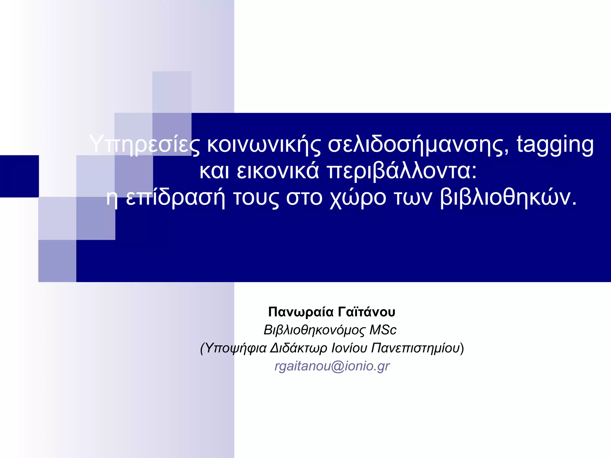 Υπηρεσίες κοινωνικής σελιδοσήμανσης, tagging και εικονικά περιβάλλοντα: η επίδρασή τους στο χώρο των βιβλιοθηκών. Πανωραία Γαϊτάνου Βιβλιοθηκονόμος MSc (Υποψήφια Διδάκτωρ Ιονίου Πανεπιστημίου ) [email_address]