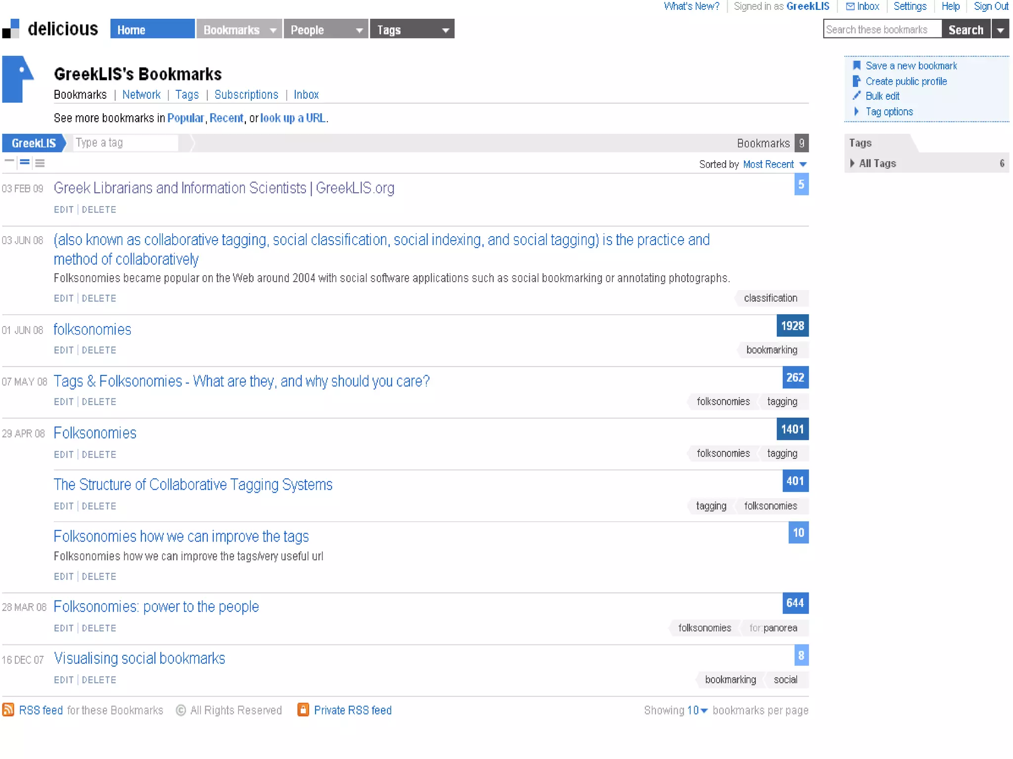 Delicious (2/2)Μη ιεραρχικό σύστημα κατηγοριοποίησης λέξεων-κλειδιών οι χρήστες εισάγουν ετικέτες στις επιλεγμένες πηγές τους μέσα από ένα μεγάλο σύνολο επιλεγμένων όρων (folksonomies) Καινοτόμα χαρακτηριστικά: απλό περιβάλλον διεπαφής με το χρήστη RSS feeds για διάχυση στον ιστό Αναρτήσεις θεατές και διαθέσιμες δημοσίως