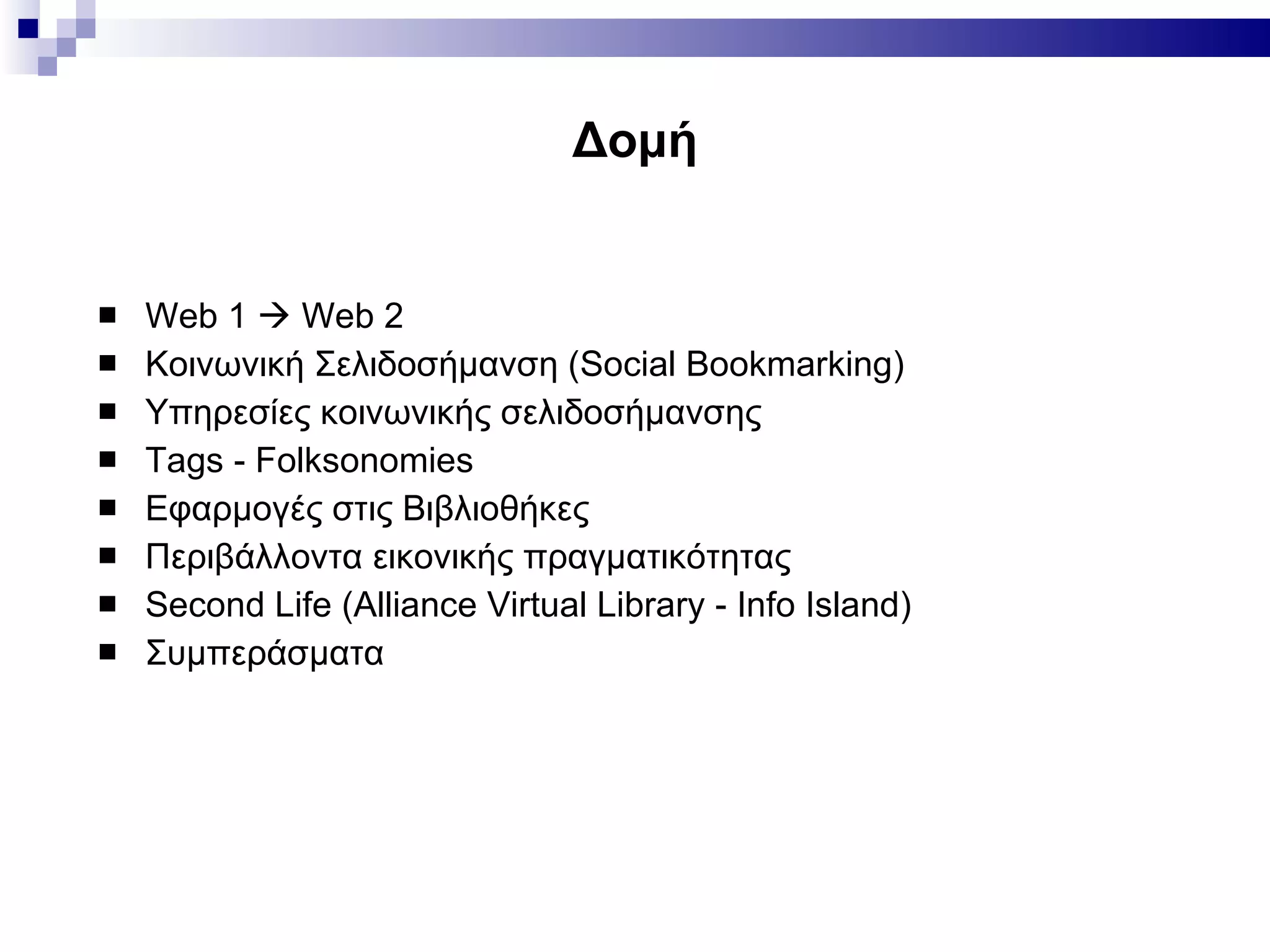 Δομή Web 1 Web 2 Κοινωνική Σελιδοσήμανση ( Social Bookmarking ) Υπηρεσίες κοινωνικής σελιδοσήμανσης Tags - Folksonomies Εφαρμογές στις Βιβλιοθήκες Περιβάλλοντα εικονικής πραγματικότητας Second Life ( Alliance Virtual Library - Info Island) Συμπεράσματα