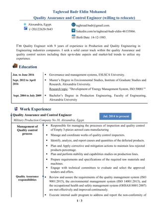 Taghread Badr Eldin Mohamed is a Quality Assurance and Control Engineer with 9 years of experience in production and quality engineering roles. She holds a Master's degree in Environmental Studies and is seeking a career opportunity to utilize her experience in quality assurance, quality control, and their related aspects and trends. Her experience includes managing quality control processes, internal auditing, and implementing quality, environmental, and energy management systems.