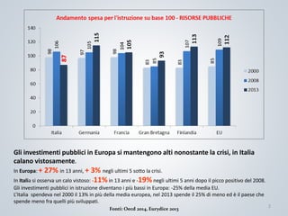 Negli ultimi 15 anni, gli investimenti pubblici per l'istruzione in Italia hanno subito un calo significativo, diventando i più bassi in Europa, con una spesa che è passata da 13% sopra la media europea nel 2000 a 25% sotto nel 2013. La spesa privata per l'istruzione è aumentata, con le famiglie che sopperiscono al calo degli investimenti pubblici, rendendo l'istruzione sempre più un bene commerciale invece che un diritto. Il disimpegno dello stato nei confronti dell'istruzione pubblica è evidenziato da ingenti tagli ai fondi e dal crescente onere sui cittadini.