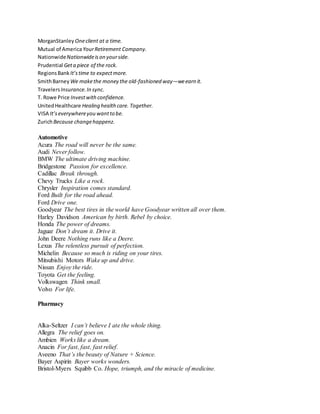 This document contains slogans and taglines from various companies across multiple industries, including computers/technology, insurance/financial services, automotive, pharmacy, restaurants, consumer package goods, business services, travel services, media, industry/energy, and other industries. Many slogans emphasize qualities like reliability, innovation, customer service, and brand leadership. Others highlight feelings of confidence, happiness, or relaxation that customers may experience through the company's products.