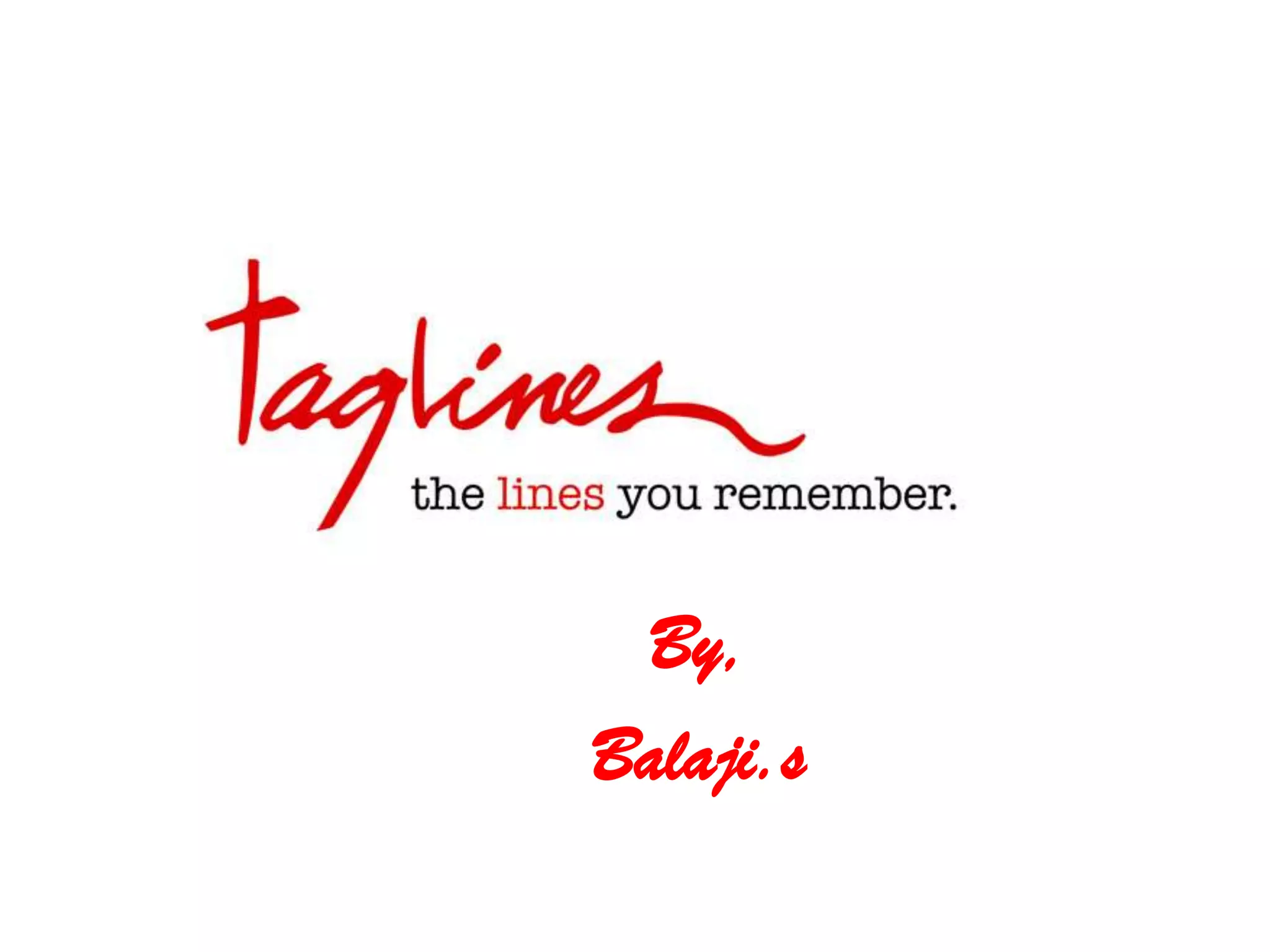 The document discusses taglines, which are short, memorable phrases used by companies to identify themselves and promote their brands. It notes that effective taglines attract attention and are not the same as mission statements. The document then categorizes different types of taglines, such as those that are descriptive of a company or product, persuasive, or provocative. It concludes with a quiz identifying well-known company taglines.