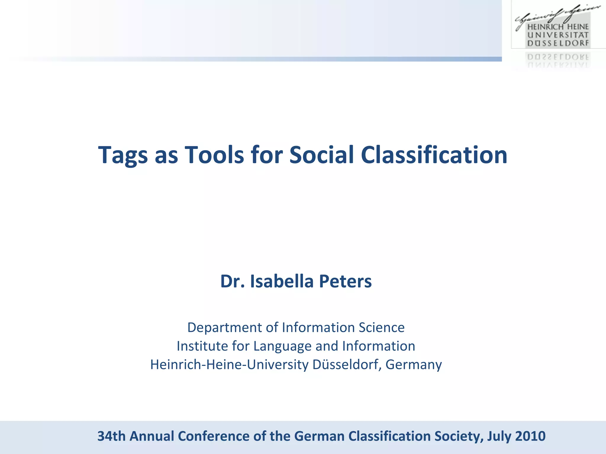 The document discusses social classification based on folksonomies, highlighting the importance of power tags derived from user-generated tagging. It outlines methods for automatically building social classifications and evaluating the relevance of tags, identifying issues such as subjective judgments in tag relevance. The study emphasizes that tag distributions stabilize over time, allowing for the effective extraction of relevant tags for categorization.