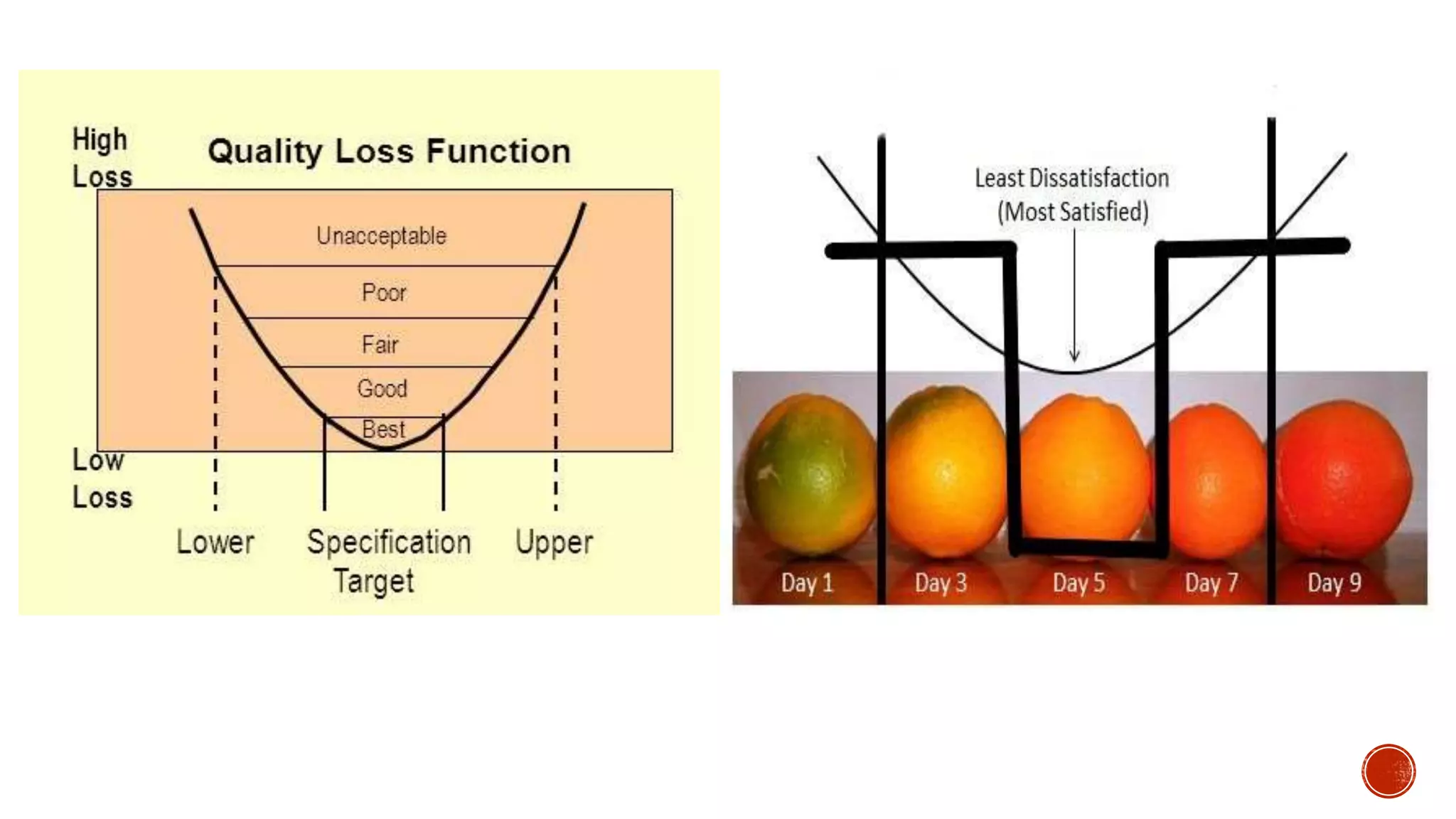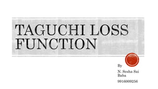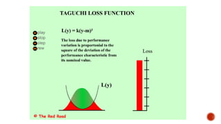 The document discusses quality loss and the Taguchi loss function. It explains that the Taguchi loss function graphically depicts how small variations within specifications can exponentially increase customer dissatisfaction. There are controllable and uncontrollable factors that influence product quality. The Taguchi method aims to select controllable factor levels that minimize sensitivity to uncontrollable interference. It also discusses parameter design, tolerance design, and formulas for calculating quality loss based on the deviation from the target value.