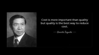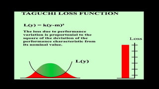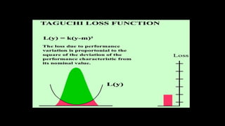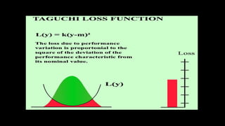 The document discusses the Taguchi Method, a statistical approach designed to improve product quality and optimize processes across various fields such as engineering and marketing. It outlines the method's three main stages: system design, parameter design, and tolerance design, while also introducing concepts like loss functions and quality circles for employee involvement in quality improvement. Additionally, the document describes the steps for implementing the Taguchi Method and the importance of designing experiments for effective analysis and results.