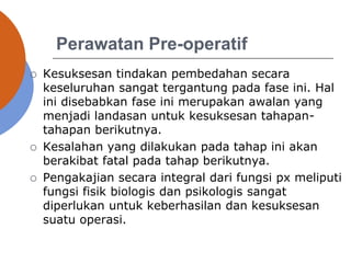 Dokumen tersebut membahas persiapan pasien sebelum operasi, meliputi penilaian kesehatan umum, status nutrisi dan cairan, persiapan fisik seperti pencukuran daerah operasi, latihan pra-operasi, serta pemeriksaan penunjang seperti laboratorium dan radiologi untuk mengetahui kondisi kesehatan pasien sebelum operasi."