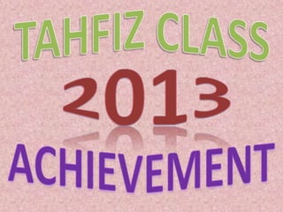 Yasmeen bt Mohd Sanusi attended PusPeTa preschool from ages 4 to 6, where she memorized the entire 30th chapter of the Quran and surah Yasin by age 6. She continued her Quran studies until age 12, memorizing additional chapters. Abdul Muhaimin b Yusoff also attended PusPeTa preschool from ages 5 to 6 and continued Quran studies until age 12, memorizing the same chapters as Yasmeen. Both students received excellent results on their UPSR exams and are now attending secondary schools specializing in Quran studies.
