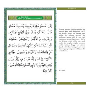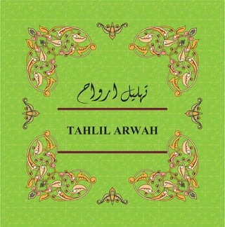 Dokumen ini adalah bacaan tahlil arwah yang mengandungi doa untuk Nabi Muhammad, ibubapa, serta semua roh, dengan penekanan pada permohonan ampunan dan rahmat dari Allah. Ia menyampaikan pujian kepada Allah dan memohon petunjuk serta perlindungan dari kejahatan. Selain itu, terdapat juga pembacaan ayat-ayat al-Quran yang menekankan keesaan Allah dan kewajiban umat Muslim untuk beriman dan berselawat ke atas Nabi Muhammad.