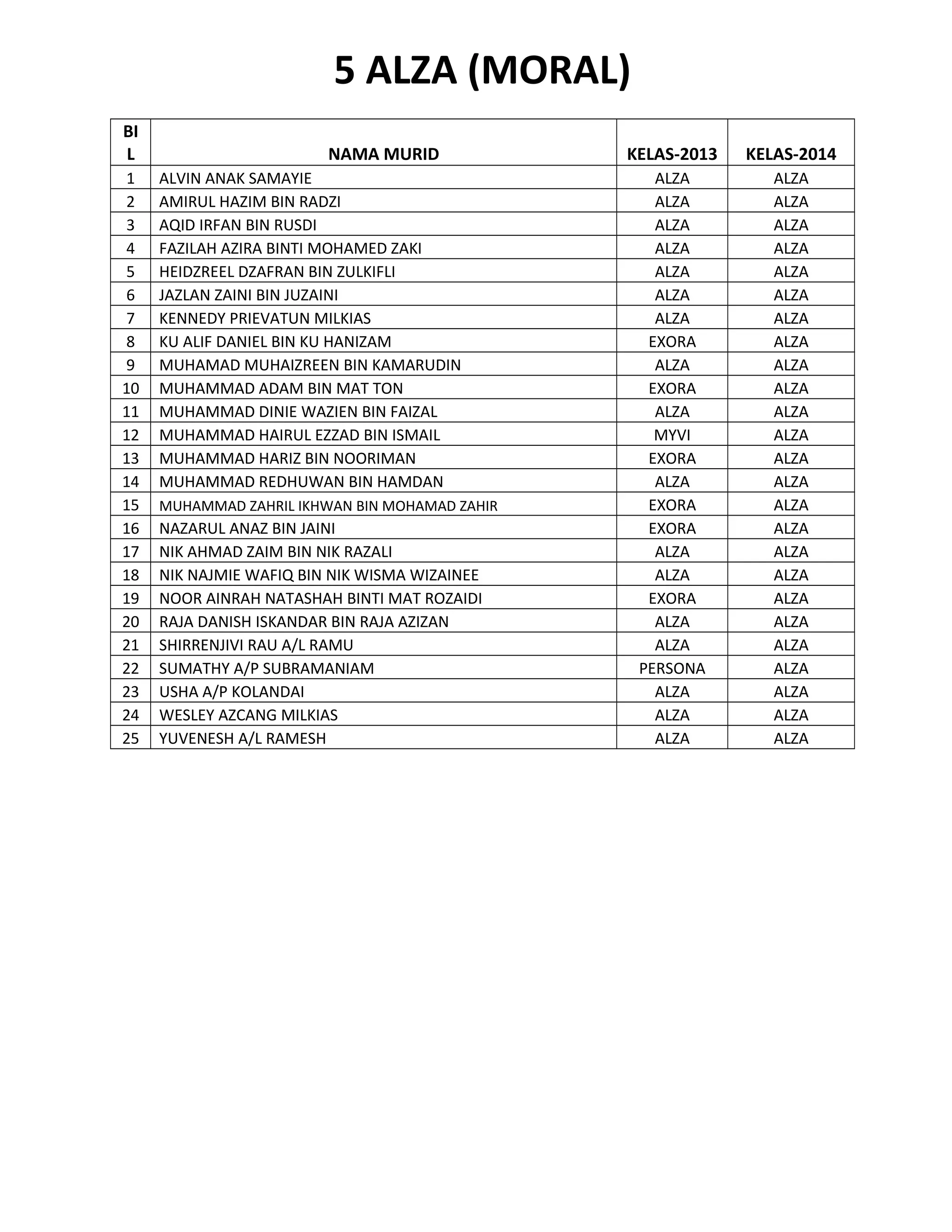 This document contains lists of students' names from several different classes in 2013 and 2014. It provides the students' names, the class they were in for each year, and the type of car each was assigned (e.g. Alza, Exora, Myvi). The classes included are Alza, Exora, Iswara, Myvi and Persona and it shows how the car assignments changed between 2013 and 2014.