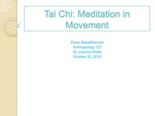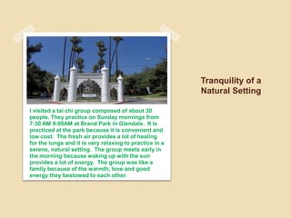 The document summarizes a visit to a Tai Chi group that meets weekly in a park. It describes the mixed attire of participants, the various exercises performed before and after Tai Chi practice, including breathing exercises to stimulate the chakras. The group then performs the 24 forms of Tai Chi while listening to relaxing music. After Tai Chi, the group prays, meditates, and sends messages of peace. The group includes people of various ages, and some learn self-defense techniques using fans.