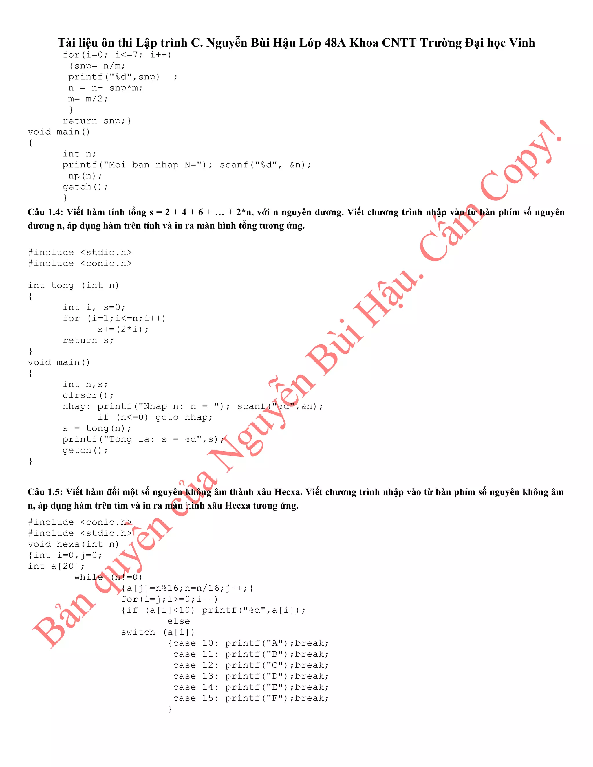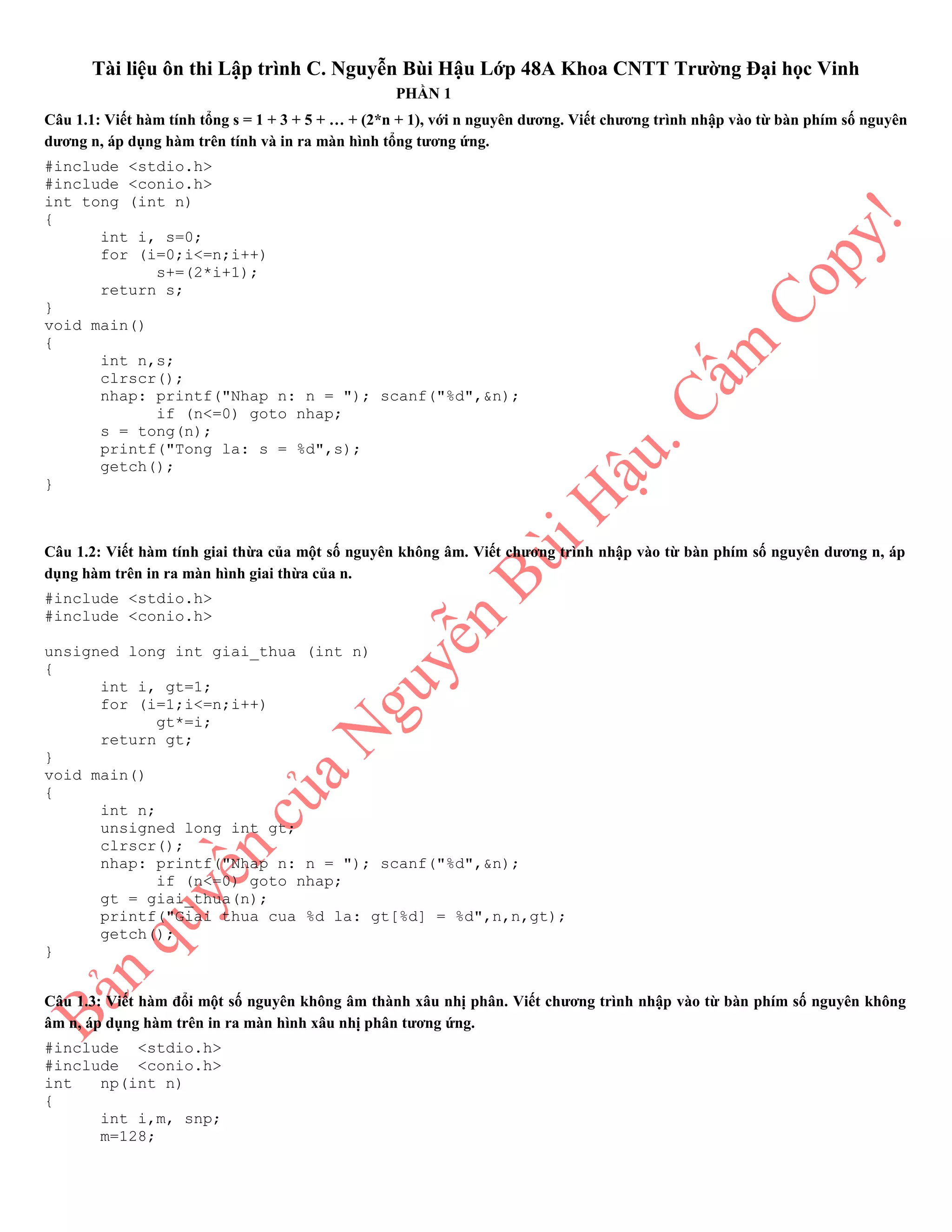 Tài liệu hướng dẫn ôn thi lập trình C bao gồm nhiều bài tập về cách viết hàm và chương trình cho các phép toán, chuyển đổi số, và kiểm tra tính chất của số. Các bài tập này bao gồm tính tổng, giai thừa, kiểm tra nguyên tố, kiểm tra số hoàn thiện, và các phép toán trên tam giác. Mỗi bài tập đều dẫn dắt cách nhập liệu từ người dùng và in kết quả ra màn hình.