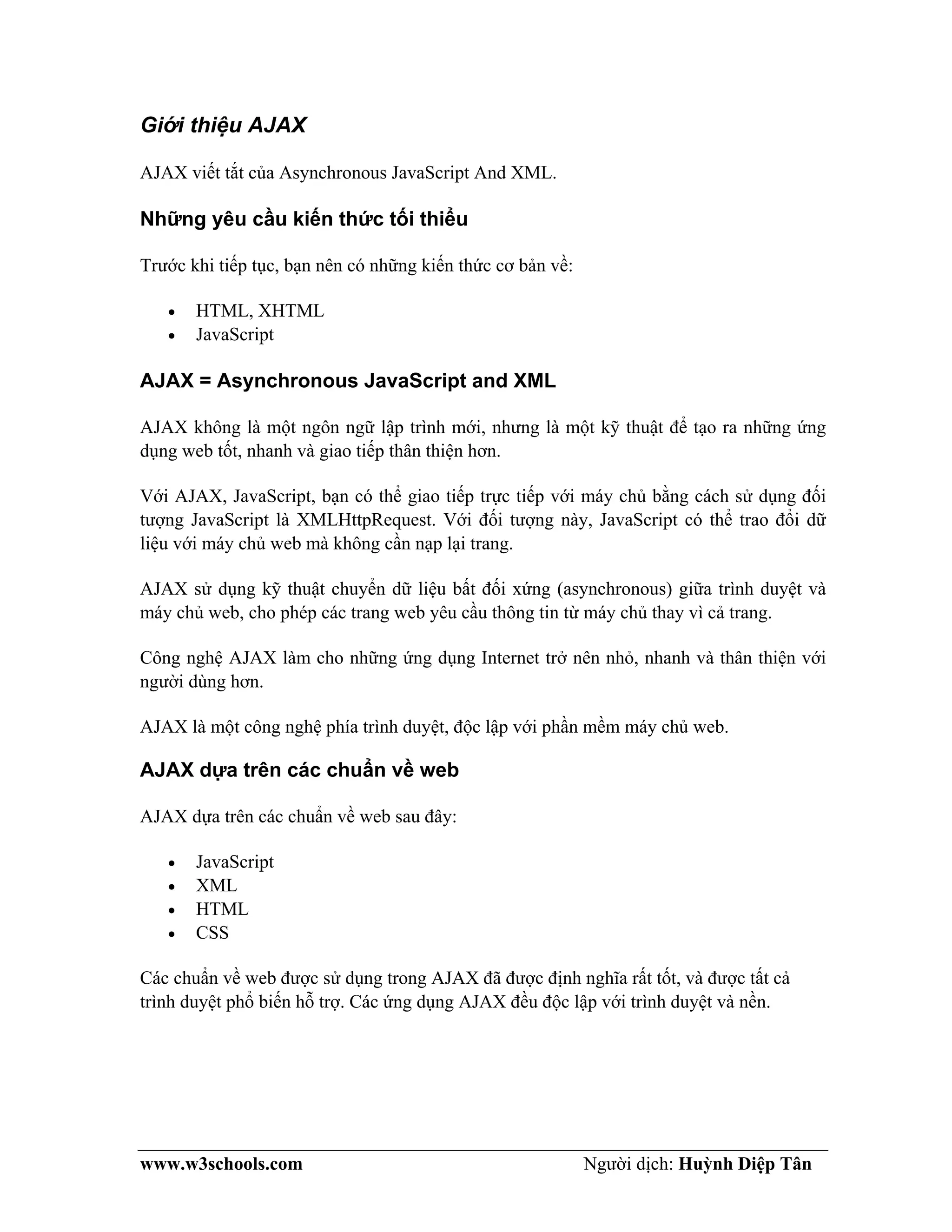 Ajax là viết tắt của Asynchronous JavaScript and XML, là một kỹ thuật lập trình giúp tạo ra các ứng dụng web nhanh và thân thiện hơn, cho phép giao tiếp trực tiếp với máy chủ mà không cần tải lại trang. Ajax sử dụng đối tượng XMLHttpRequest để gửi yêu cầu và nhận dữ liệu từ máy chủ một cách không đồng bộ. Nó dựa trên các chuẩn web như JavaScript, XML, HTML và CSS, và đã trở nên phổ biến từ năm 2005 nhờ Google Suggest.