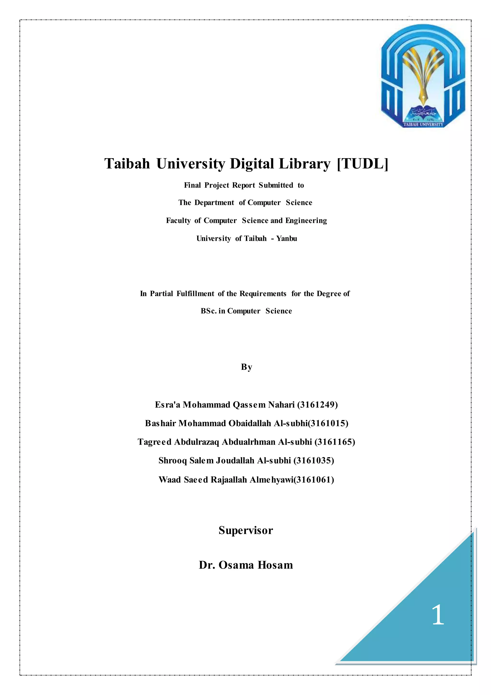 The document outlines a final project report for the creation of the Taibah University Digital Library (TUDL), designed to provide students and faculty access to course-related materials online. It details the project's motivation, objectives, methodologies, and the stages of development, including requirements gathering, design, implementation, and verification. The project aims to alleviate the lack of an electronic library for course materials at Taibah University, improving accessibility for students and faculty.