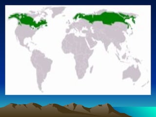 The taiga biome, also known as the boreal forest, is the largest terrestrial biome. Located near mountains and forests in Eurasia and North America, the taiga has very cold winters with snow and warmer, rainy summers where coniferous plants like birch, aspen, larch, alder and red cedar grow. During the short springs and autumns, millions of insects inhabit the taiga, which is also home to fauna such as red foxes, wolverines, river otters, grizzly bears and bobcats.