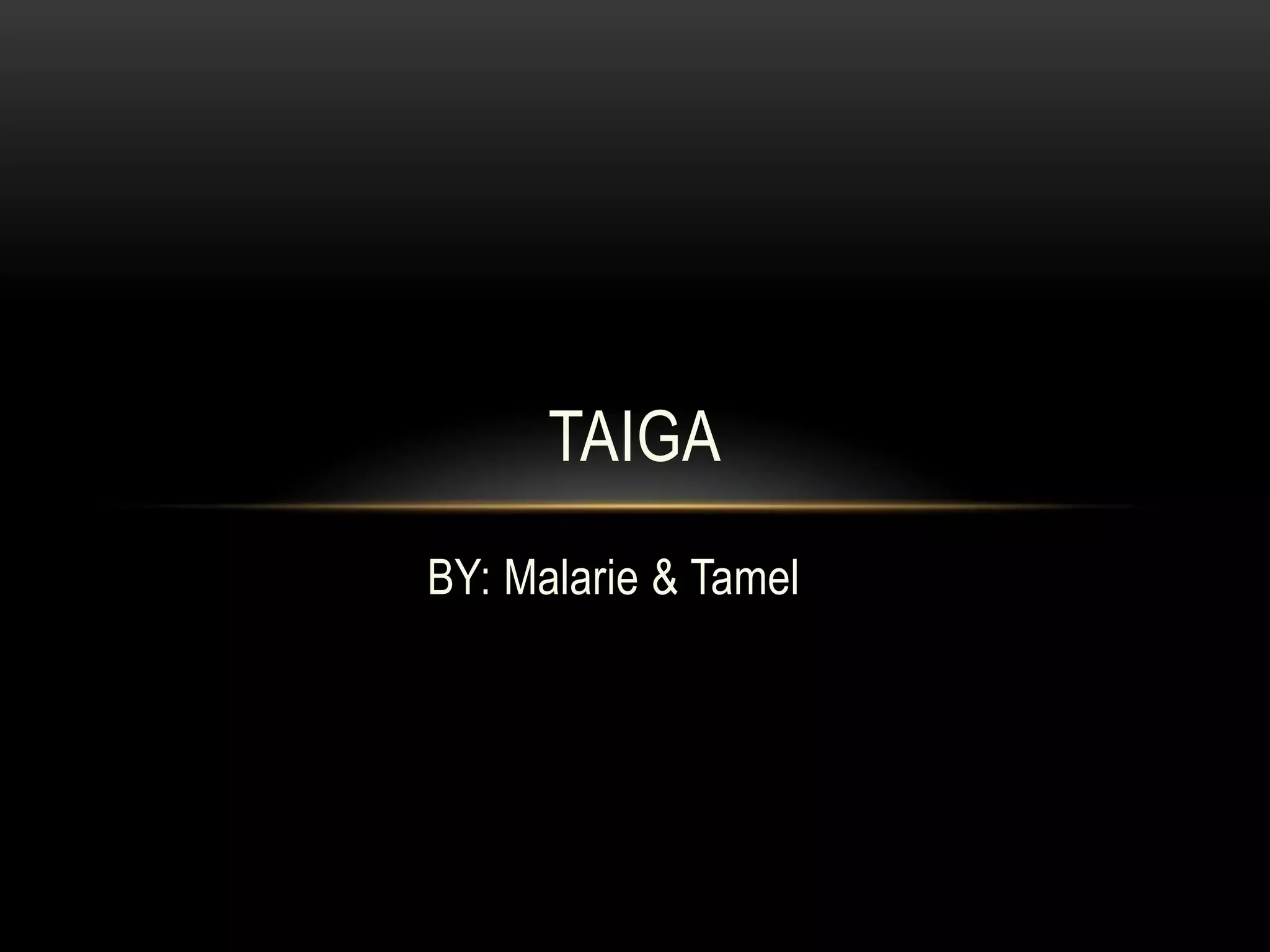 The taiga biome is located in upper Canada, Alaska, Russia, and South America. It has biotic factors like black foxes, foxes, squirrels, and deer, and abiotic factors including wind, air, snow, and trees. Temperatures in the taiga range from -65°F to 70°F (-54°C to 21°C) in the winter and summer, respectively. Threats to the taiga include deforestation, pollution from vehicles and factories, which contribute to climate change concerns. Several species are endangered, such as lynx, wood bison, and Siberian tiger.