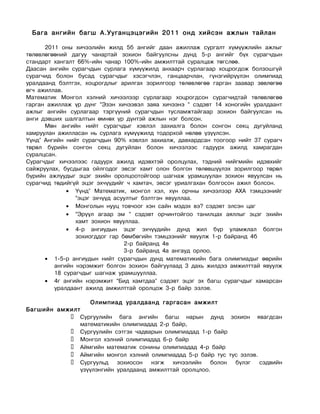 À.Óóãàíöýöýãèéí 201 1 îíä õèéñýí àæëûí òàéëàí 2011 îíû õè÷ýýëèéí æèëä 5á àíãèéã äààí àæèëëàæ ñóðãàëò õ¿ì¿¿æëèéí àæëûã òºëºâëºãººíèé äàãóó ÷àíàðòàé çîõèîí áàéãóóëñíû ä¿íä 5-ð àíãèéã á¿õ ñóðàã÷äûí ñòàíäàðò õàíãàëò 66%-èéí ÷àíàð 100%-èéí àìæèëòòàé ñóðàëöàæ òºãñ뺺. Äààñàí àíãèéí ñóðàã÷äûí ñóðëàãà õ¿ì¿¿æèëä àíõààð÷ ñóðëàãààð õîöðîãäîæ áîëçîøã¿é ñóðàã÷èä áîëîí áóñàä ñóðàã÷äûã õýñýã÷ëýí, ãàíöààð÷ëàí, ã¿íçãèéð¿¿ëýí îëèìïèàä óðàëäààíä áýëòãýõ, õîöðîãäëûã àðèëãàõ çîðèëãîîð òºëºâëºãºº ãàðãàí çààâàð çºâëºãºº ºã÷ àæèëëàâ. Ìàòåìàòèê Ìîíãîë õýëíèé õè÷ýýëýýð ñóðëàãààð õîöðîãäñîí ñóðàã÷èäòàé òºëºâëºãºº ãàðãàí àæèëëàæ ¿ð ä¿íã “Ýçýí õè÷ýýâýë çàÿà õè÷ýýíý “ ñýäýâò 14 õîíîãèéí óðàëäààíò àæëûã àíãèéí ñóðëàãààð òýðã¿¿íèé ñóðàã÷äûí òóñëàìæòàéãààð çîõèîí áàéãóóëñàí íü àíãè äýâøèõ øàëãàëòûí ºìíºõ ¿ð ä¿íòýé àæëûí íýã áîëñîí. ̺í àíãèéí íèéò ñóðàã÷äûã õýâëýë çàõèàëãà áîëîí ñîíãîí ñåêö äóãóéëàíä õàìðóóëàí àæèëëàñàí íü ñóðëàãà õ¿ì¿¿æèëä òîäîðõîé íºëºº ¿ç¿¿ëñýí. ¯¿íä” Àíãèéí íèéò ñóðàã÷äûí 90% õýâëýë çàõèàëæ, äàâõàðäñàí òîîãîîð íèéò 37 ñóðàã÷ òºðºë á¿ðèéí ñîíãîí ñåêö äóãóéëàí áîëîí õè÷ýýëýýñ ãàäóóðõ àæèëä õàìðàãäàí ñóðàëöñàí. Ñóðàã÷äûã õè÷ýýëýýñ ãàäóóðõ àæèëä èäýâõòýé îðîëöóëàõ, òýäíèé íèéãìèéí èäýâõèéã ñàéæðóóëàõ, áóñäûãàà îéëãîäîã ýâñýã õàìò îëîí áîëãîí òºëºâø¿¿ëýõ çîðèëãîîð òºðºë á¿ðèéí àæëóóäûã ýöýã ýõèéí îðîëöîîòîéãîîð øàãíàæ óðàìøóóëàí çîõèîí ÿâóóëñàí íü ñóðàã÷èä òºäèéã¿é ýöýã ýõ÷¿¿äèéã ÷ õàìòà÷, ýâñýã óðèàëãàõàí áîëãîñîí àæèë áîëñîí. • ¯¿íä” Ìàòåìàòèê, ìîíãîë õýë, õ¿í îð÷íû õè÷ýýëýýð ÀÕÀ òýìöýýíèéã “ýöýã ýõ÷¿¿ä àñóóëòûã áýëòãýí ÿâóóëëàà. • Ìîíãîëûí íóóö òîâ÷îîã õýí ñàéí ìýäýõ âý? ñýäýâò ýëñýí öàã • “Ýð¿¿ë àãààð ýì “ ñýäýâò îð÷èíòîéãîî òàíèëöàõ àÿëëûã ýöýã ýõèéí õàìò çîõèîí ÿâóóëëàà. • 4-ð àíãèóäûí ýöýã ýõ÷¿¿äèéí äóíä æèë á¿ð óëàìæëàë áîëãîí çîõèîãääîã ãàð áºìáºãèéí òýìöýýíèéã ÿâóóëæ 1-ð áàéðàíä 4á 2-ð áàéðàíä 4â 3-ð áàéðàíä 4à àíãàóä îðëîî. • 1-5-ð àíãèóäûí íèéò ñóðàã÷äûí äóíä ìàòåìàòèêèéí áàãà îëèìïèàäûã ººðèéí àíãèéí íýðýìæèò áîëãîí çîõèîí áàéãóóëààä 3 äàõü æèëäýý àìæèëòòàé ÿâóóëæ 18 ñóðàã÷äûã øàãíàæ óðàìøóóëëàà. • 4ã àíãèéí íýðýìæèò “Áèä õàìòäàà” ñýäýâò ýöýã ýõ áàãø ñóðàã÷äûã õàìàðñàí óðàëäààíò àæèëä àìæèëòòàé îðîëöîæ 3-ð áàéð ýçëýâ. Îëèìïèàä óðàëäààíä ãàðãàñàí àìæèëò Áàãøèéí àìæèëò Ñóðãóóëèéí áàãà àíãèéí áàãø íàðûí äóíä çîõèîí ÿâàãäñàí ìàòåìàòèêèéí îëèìïèàäàä 2-ð áàéð, Ñóðãóóëèéí ñýòãýõ ÷àäâàðûí îëèìïèàäàä 1-ð áàéð Ìîíãîë õýëíèé îëèìïèàäàä 6-ð áàéð Àéìãèéí ìàòåìàòèê ñîíèíû îëèìïèàäàä 4-ð áàéð Àéìãèéí ìîíãîë õýëíèé îëèìïèàäàä 5-ð áàéð òóñ òóñ ýçëýâ. Ñóðãóóëüä çîõèîñîí íýãæ õè÷ýýëèéí áîëîí á¿ëýã ñýäâèéí ¿ç¿¿ëýíãèéí óðàëäààíä àìæèëòòàé îðîëöëîî.